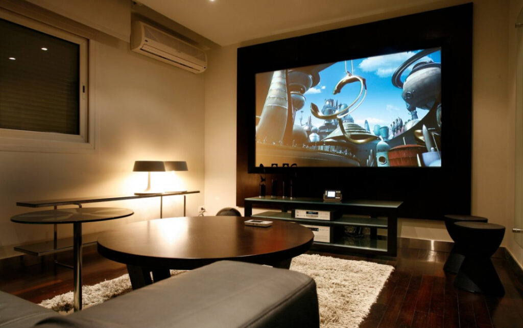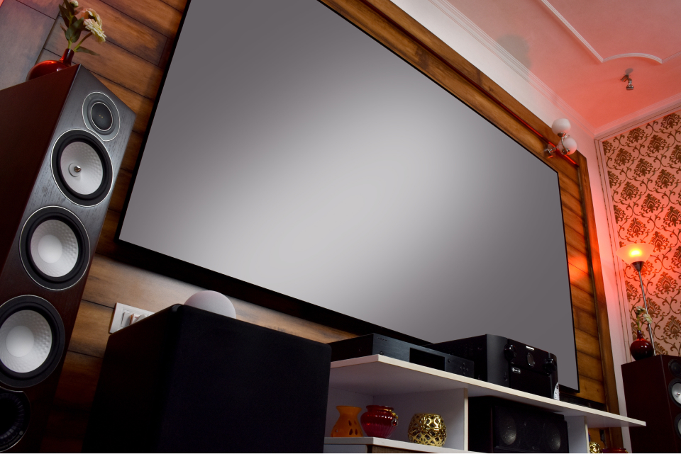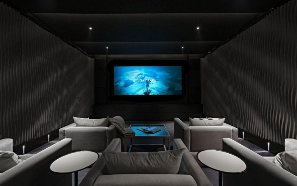 При наличии отдельного помещения оборудуется полноценный домашний кинотеатр. Для правильного звучания производится акустический расчет помещения, используются специальные акустические материалы для отделки стен и потолков. Акустика устанавливается по периметру помещения для организации идеального, близкого к реальности звука Dolby Atmos®.